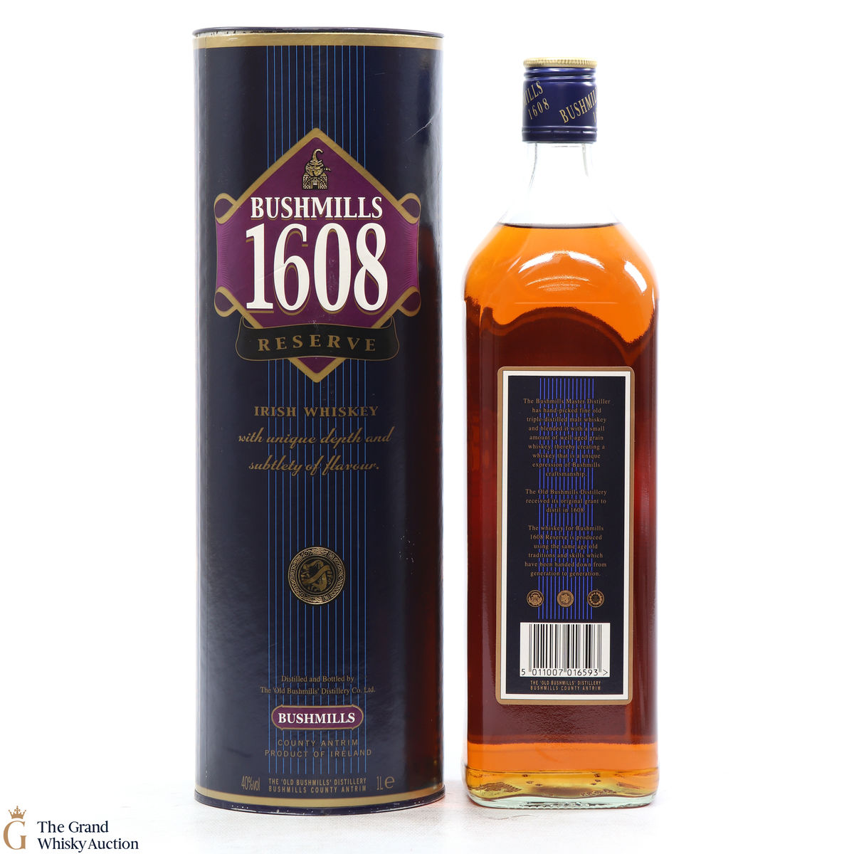 A 1L bottle of Bushmills 1608 Reserve. Made up of bourbon and sherry cask matured malts - each aged for 15 years - and blended with a small amount of grain whiskey.