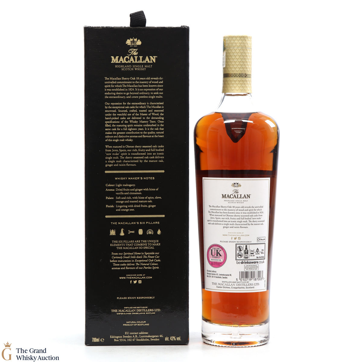 This annual release of The Macallan's popular 18 Year Old Sherry Oak is matured exclusively in sherry seasoned casks, built from both Spanish and American oak, providing a beautifully dark flavour with rich aromas.