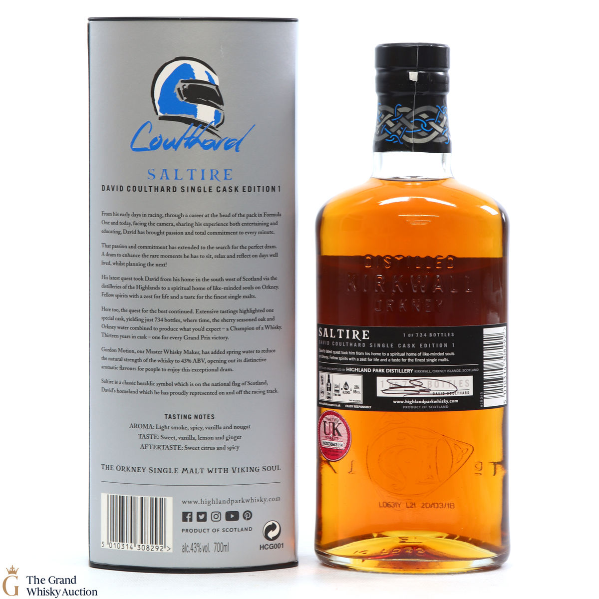 The single cask bottling, Highland Park Saltire Edition is a 13 year old whisky inspired by Coulthard’s 13 Grand Prix victories. This is one of just 734 bottles.