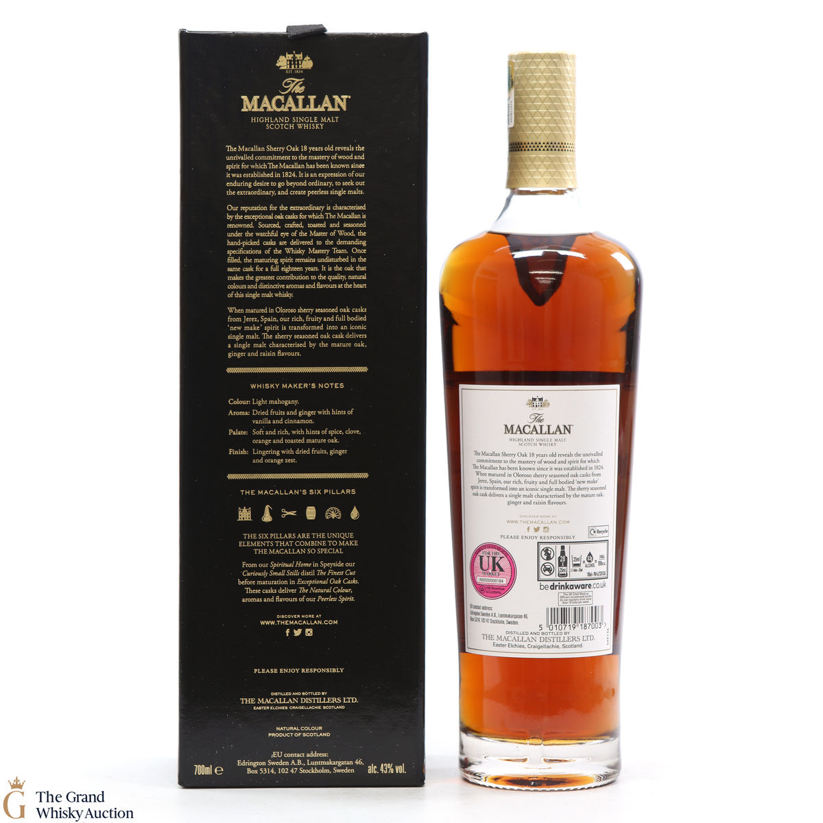 This annual release of The Macallan's popular 18 Year Old Sherry Oak is matured exclusively in sherry seasoned casks, built from both Spanish and American oak, providing a beautifully dark flavour with rich aromas.