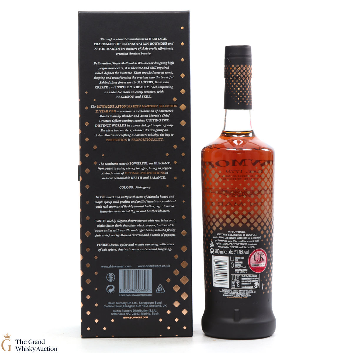 This 21-Year-Old Bowmore is a limited-edition single malt created in collaboration between Ron Welsh, Bowmore Master Blender and Marek Reichman, Aston Martin Chief Creative Officer. Matured in a combination of oloroso and Pedro Ximenez sherry casks. The result is a single malt that thrills all the senses for optimal enjoyment.