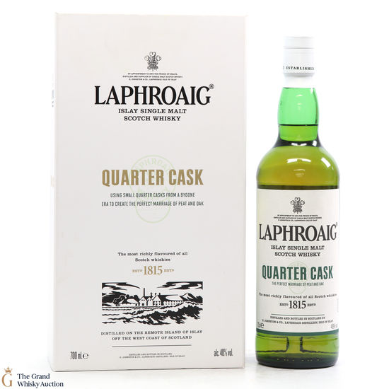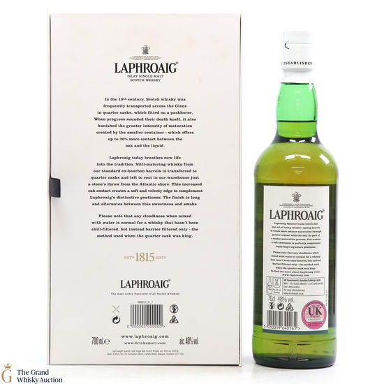 A younger, lively Laphroaig that has had the maturation process speeded up by ageing in quarter casks. As the size of the cask is smaller the maturation doesn't need to be as long. This process has created a soft sweetness and a velvety feel when first tasted, then the intense peatiness so unique to Laphroaig comes bursting through.