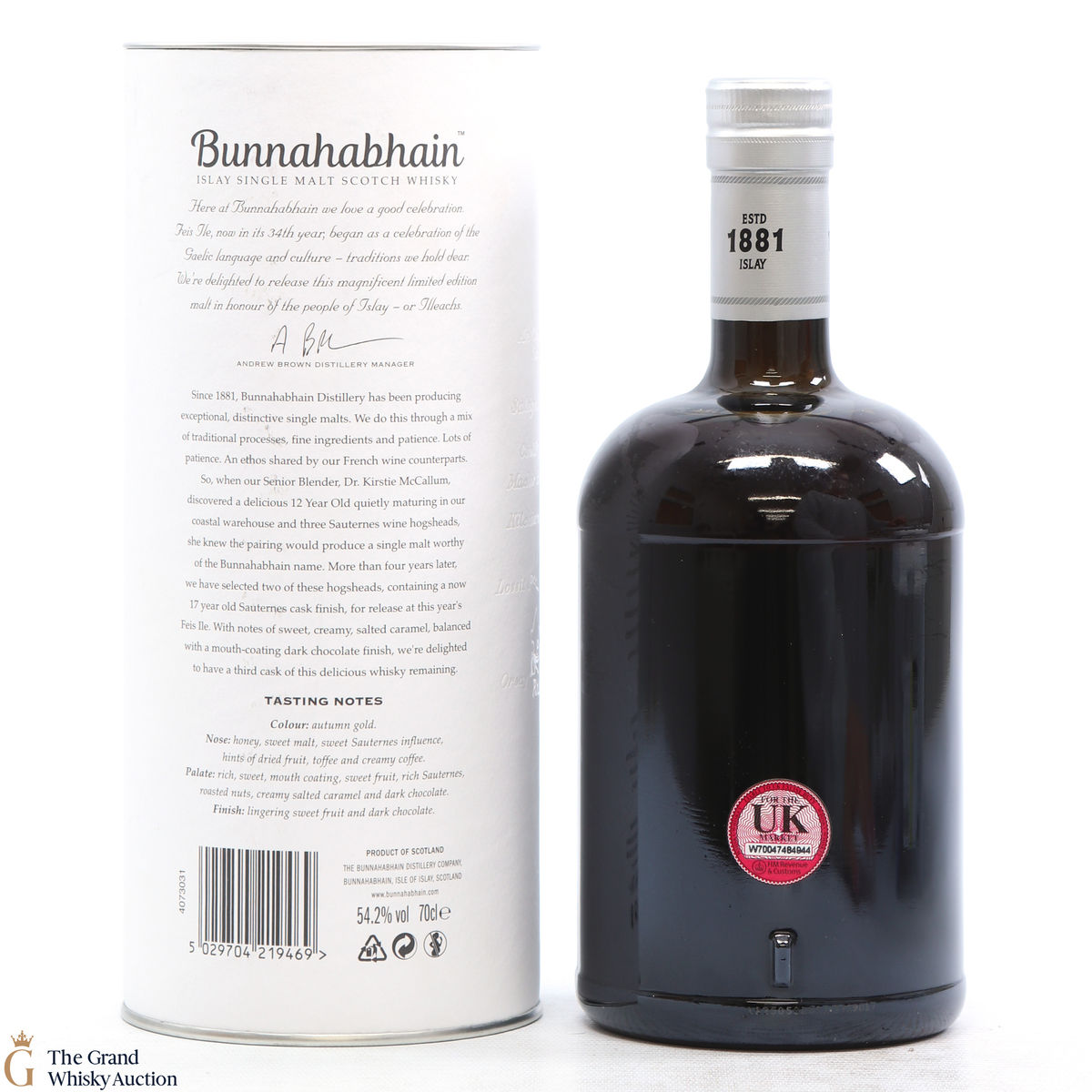 This limited edition single malt from Bunnahabhain Distillery has been matured for 17 years. For the last 5 years, the whisky was finished in Sauternes hogsheads. This release is one of 3 by Bunnahabhain for Fèis Ìle 2019. It has been bottled at 54.2% ABV. This is one of only 1118 bottles produced.