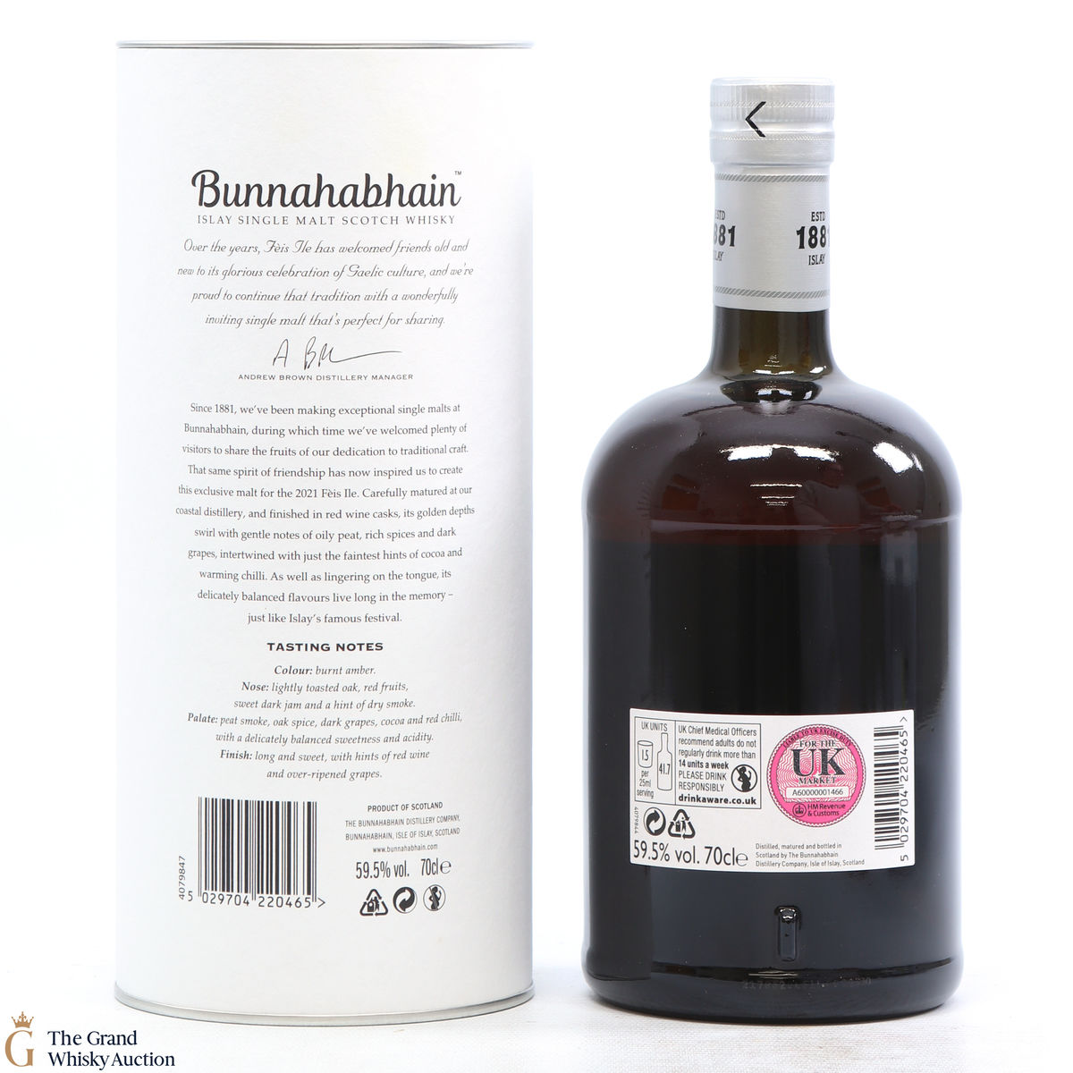 Bunnahabhain's first release for Feis Ile 2021 is this limited edition smoky whisky. Distilled on the 10th of October 2013, this single malt was finished in Moine Bordeaux casks which gives the Bunnahabhain a delicately balanced flavour. Bottled on the 25th of November 2020, this is one of only 5166 bottles produced.