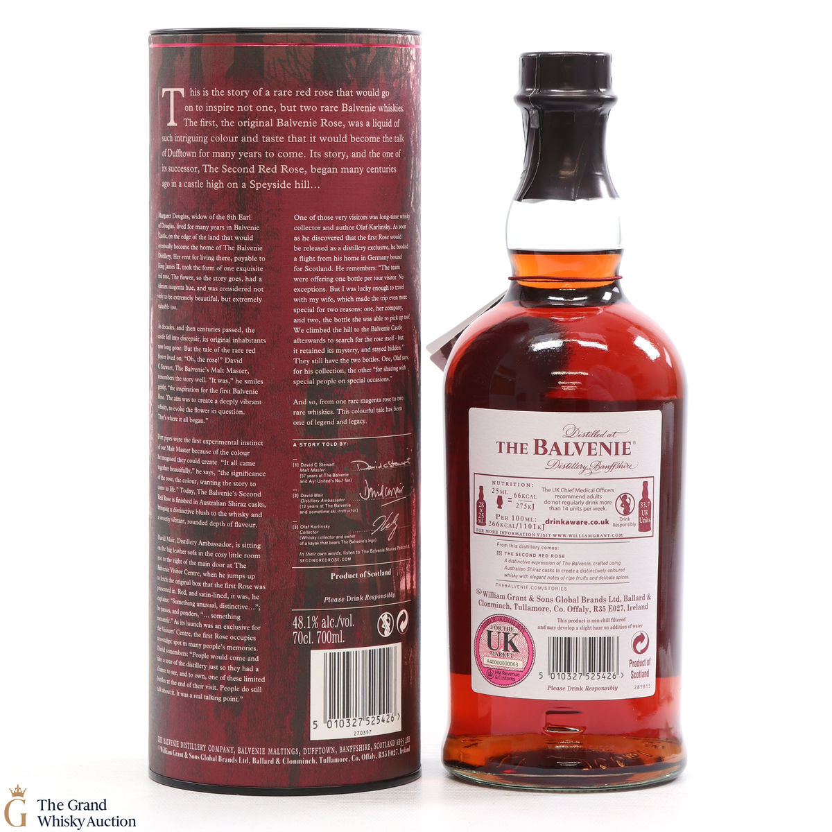 Inspired by the history of Balvenie Castle, this single malt was matured for a total of 21 years, being finished in Australian Shiraz Casks. The story of David C Stewart has created two extraordinary red roses, this is the second red rose and story number 5 in the series. Bottled at 48.1% ABV.