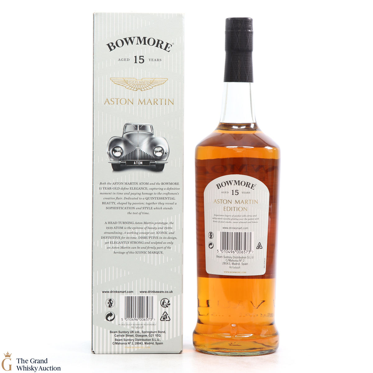 Distilled at the Bowmore Distillery in Islay, this 15 year old single malt was married in first fill bourbon casks. This is the first edition bottling to celebrate the collaboration with Aston Martin, named Dark and Intense it is available exclusively to global travellers. Each of the three editions of the Aston Martin Series features a different car, the 15 has the ATOM.