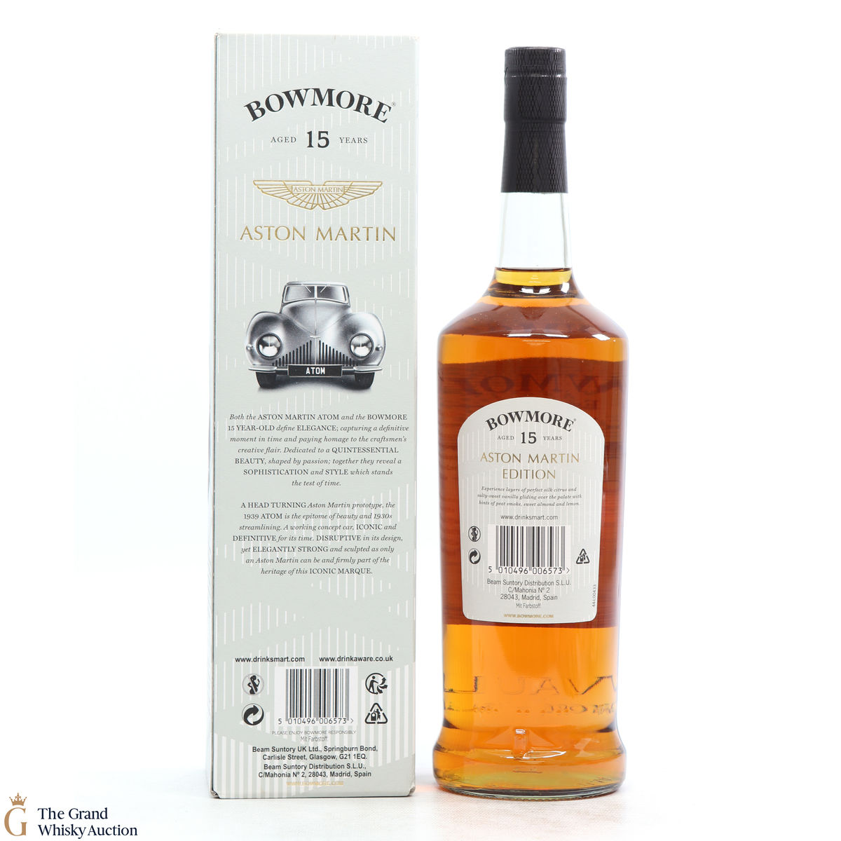 Distilled at the Bowmore Distillery in Islay, this 15 year old single malt was married in first fill bourbon casks. This is the first edition bottling to celebrate the collaboration with Aston Martin, named Dark and Intense it is available exclusively to global travellers. Each of the three editions of the Aston Martin Series features a different car, the 15 has the ATOM.
