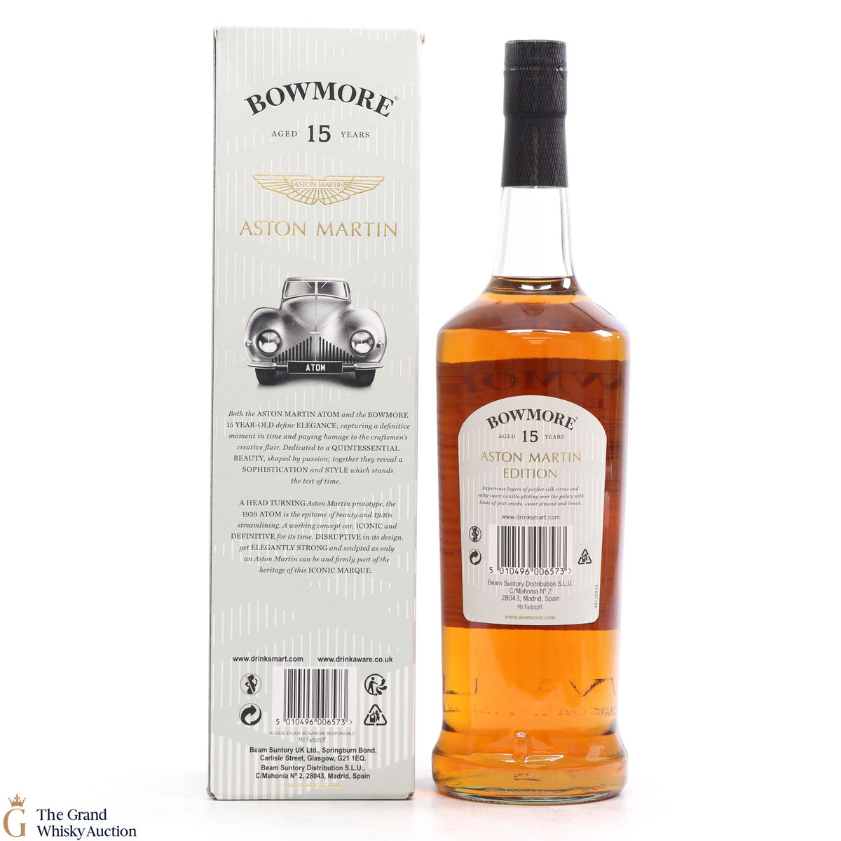 Distilled at the Bowmore Distillery in Islay, this 15 year old single malt was married in first fill bourbon casks. This is the first edition bottling to celebrate the collaboration with Aston Martin, named Dark and Intense it is available exclusively to global travellers. Each of the three editions of the Aston Martin Series features a different car, the 15 has the ATOM.