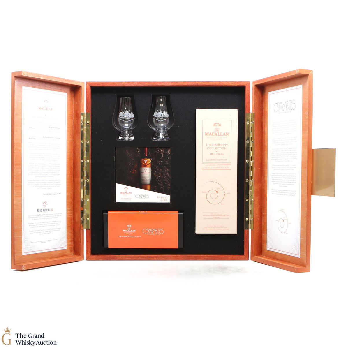 The pairing kit includes 1 x 70cl bottle of The Macallan Harmony Collection Rich Cacao, a 10-piece box of custom-made Compartés Chocolate inspired by the tasting notes of the whisky, a pairing guide and two Macallan Glencairn glasses.