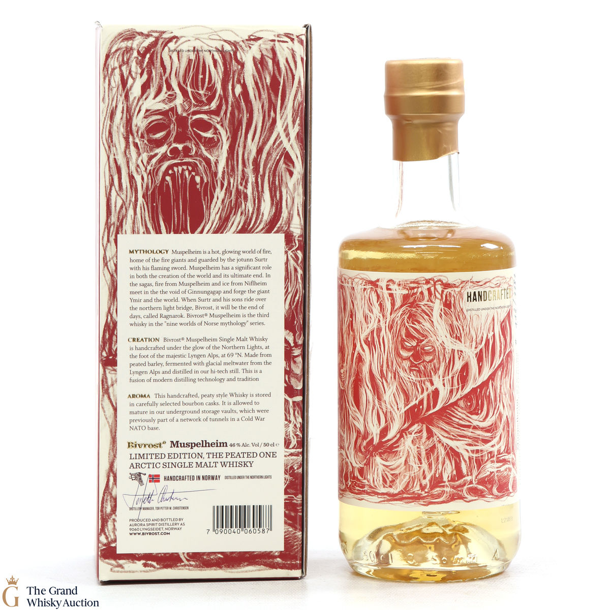 This is a limited edition bottle created in Arctic Norway was 'handcrafted under the Northern Lights'. This is a limited edition - The Peated One. Muspelheim is one of the Nine Worlds of Norse mythology - a hot and glowing land of fire, home to the fire giants and guarded by the jotunn Surtr with his flaming sword. This is a 50cl bottling.