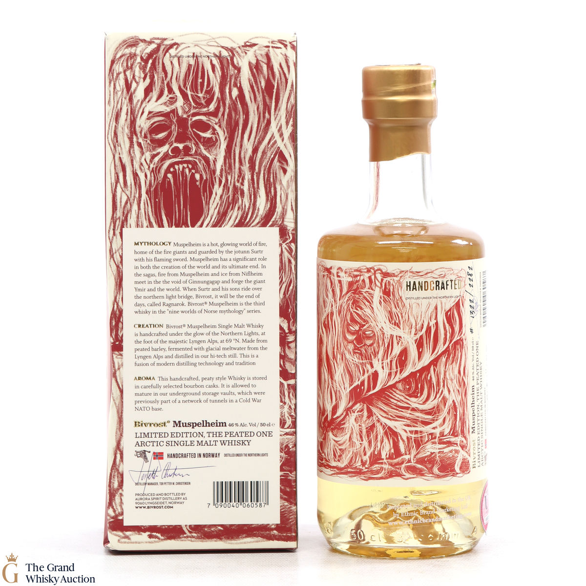 This is a limited edition bottle created in Arctic Norway was 'handcrafted under the Northern Lights'. This is a limited edition - The Peated One. Muspelheim is one of the Nine Worlds of Norse mythology - a hot and glowing land of fire, home to the fire giants and guarded by the jotunn Surtr with his flaming sword. This is a 50cl bottling.