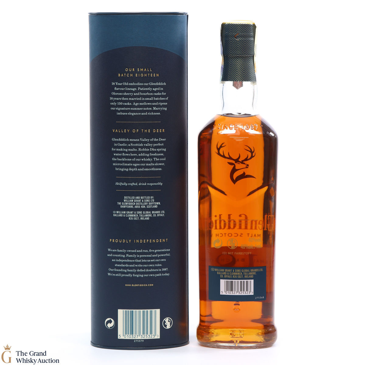 Matured in small batches the Glenfiddich 18 is arguably the most complex in the core range. The single malt has been matured in oloroso sherry and bourbon casks. It is very fragrant with tropical fruit and sherry cask influences, rich baked apple and cinnamon spice compliments by robust oak notes.