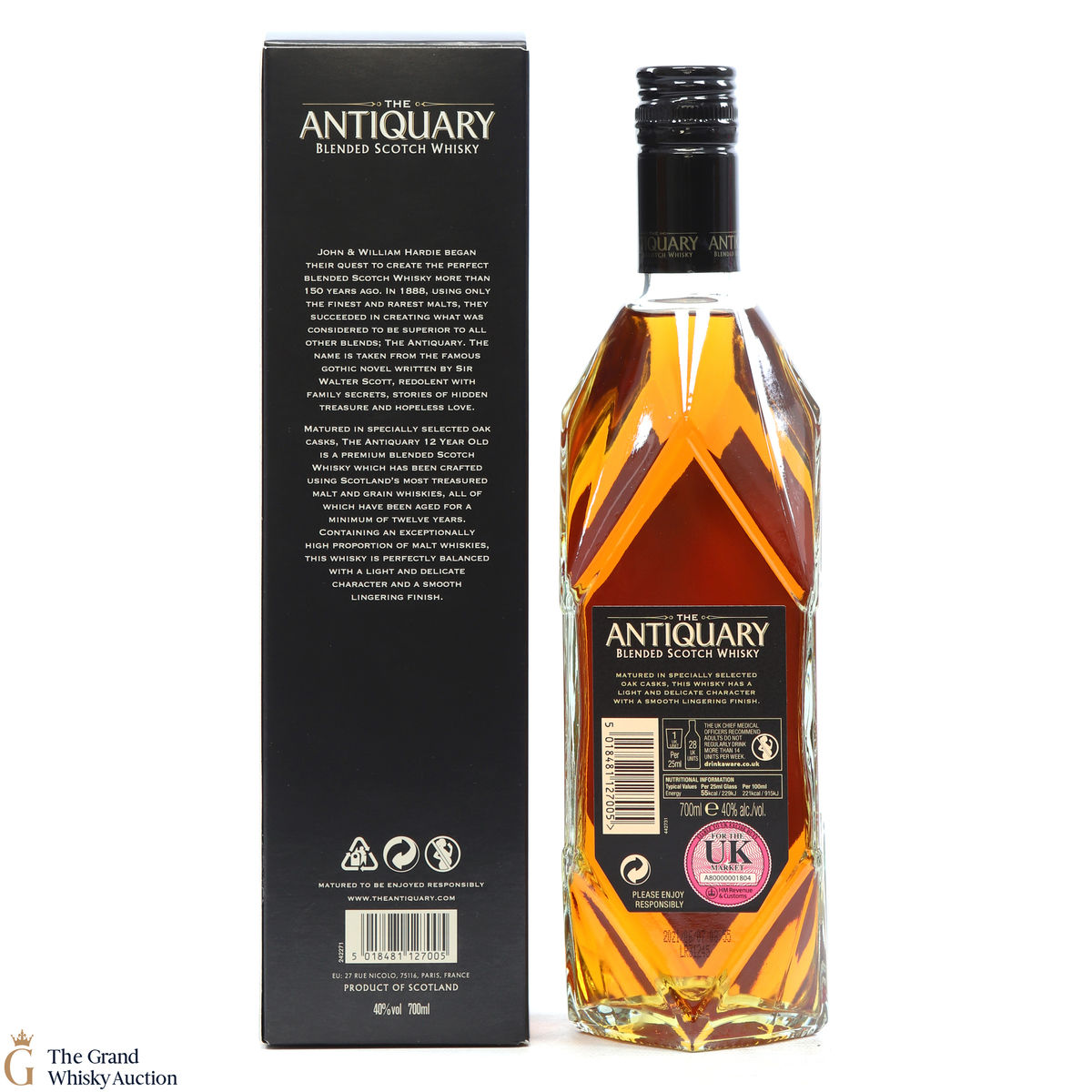 This bottling from Antiquary is a blend of some of Scotland's greatest 12-year-old malt and grain whiskies, including Royal Lochnagar, Tomatin, Cragganmore, Mortlach, Bowmore, Glenkinchie to name a few. Also, a quirky feature is that In the lid of this bottle box, there is a coaster that pops out!