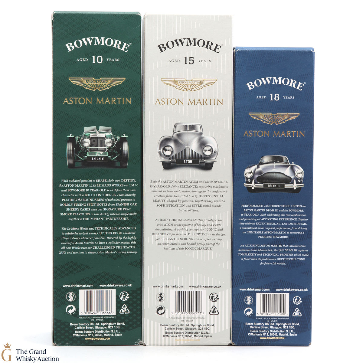 The full collection of the collaboration between Bowmore and Aston Martin, both creating timeless beauty and a lasting legacy. Each edition of the Aston Martin collection features a different car. Included in this lot is edition 1, 2 and 3:
