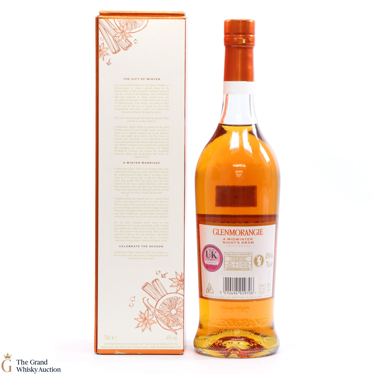 Due to the various ages of bottles and their seals, the condition of liquid is at the buyer's discretion and no claim can be lodged against failure/leakage in transit. Loss and breakage cover is available at 3% of the hammer price as standard. If the lot is not insured, no claim can be lodged against the courier or The Grand Whisky Auction for breakage or loss in transit.