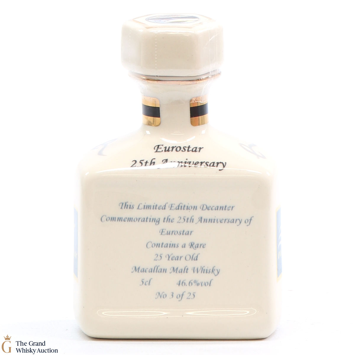A mini decanter commemorating the 25th anniversary of the Eurostar. Filled with 25 year old Macallan, this is one of 25 bottles released.