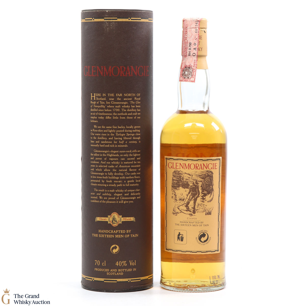 An older style bottling of Glenmorangie 10-year-old. Handcrafted by the sixteen men of Tain.