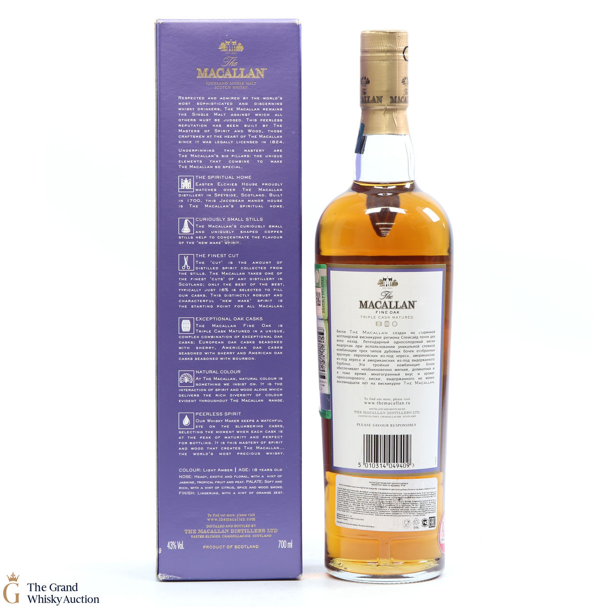 An 18 year old single malt, part of Macallan's Fine Oak range. It has been matured for eighteen years in three oak cask types; Europen oak seasoned with sherry, American oak seasoned with sherry and American oak seasoned with bourbon. This complex combination of casks has created a light amber single malt with tropical flavours balanced with wood smoke.