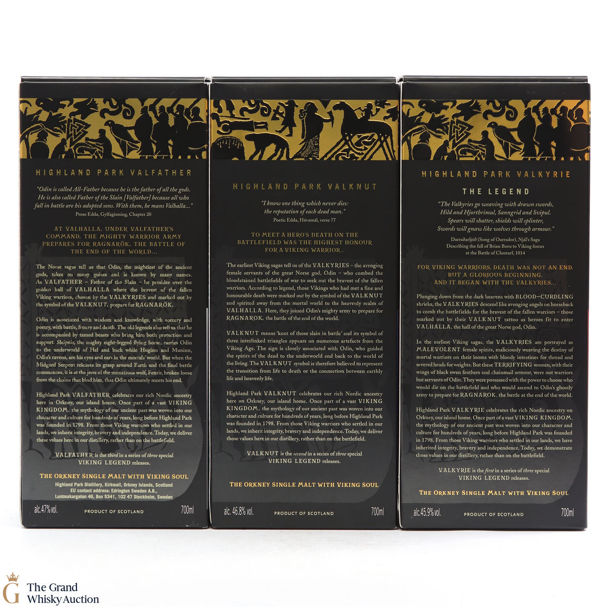 - Valfather - It is the final piece of the Highland Park Viking Legends trilogy puzzle. The whisky was matured in refill casks. Bottled at 47% ABV and 70cl.