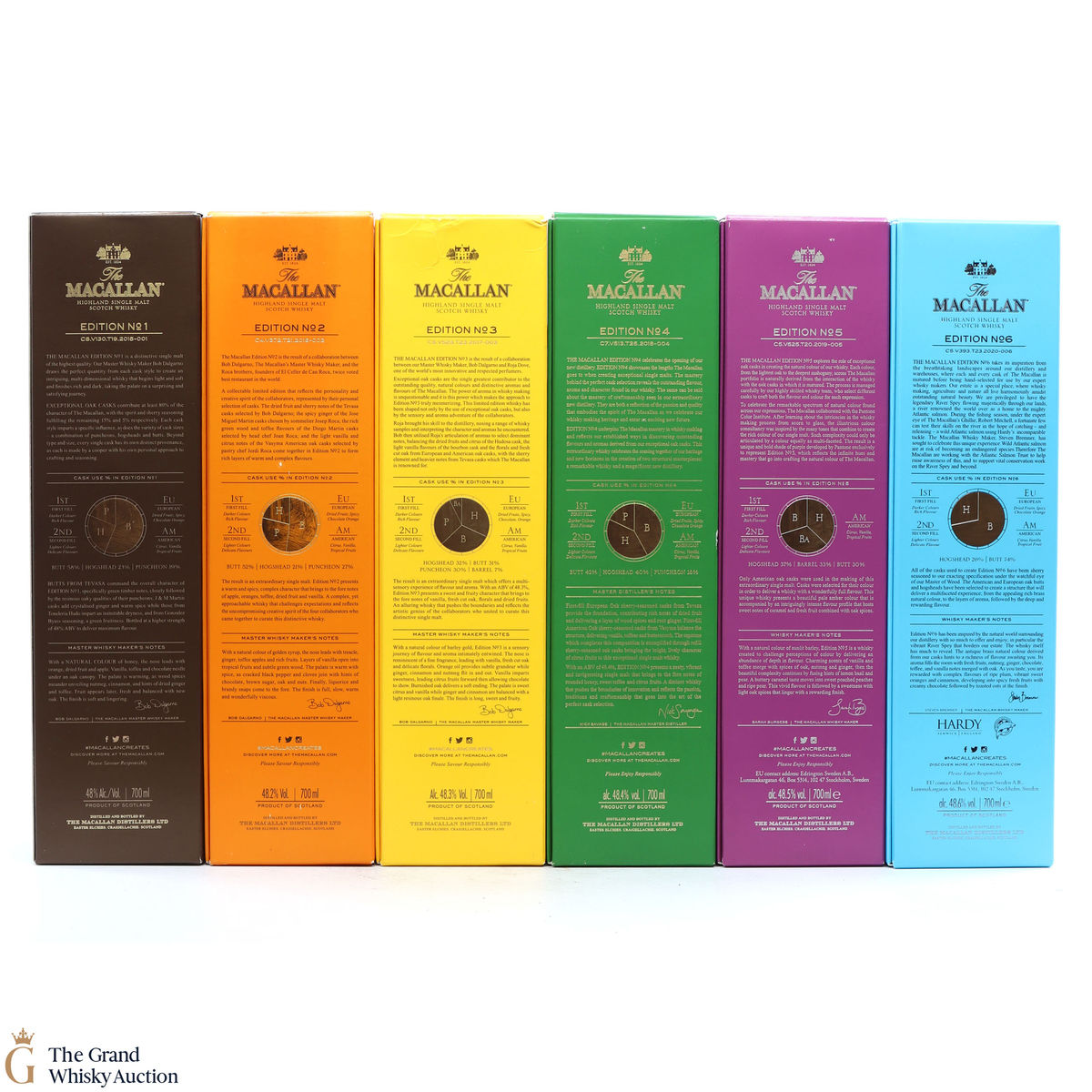 This lot brings together the Macallan Edition set to date, comprising of Edition no. 1, 2, 3 4, 5 & 6 in the annual limited edition series.