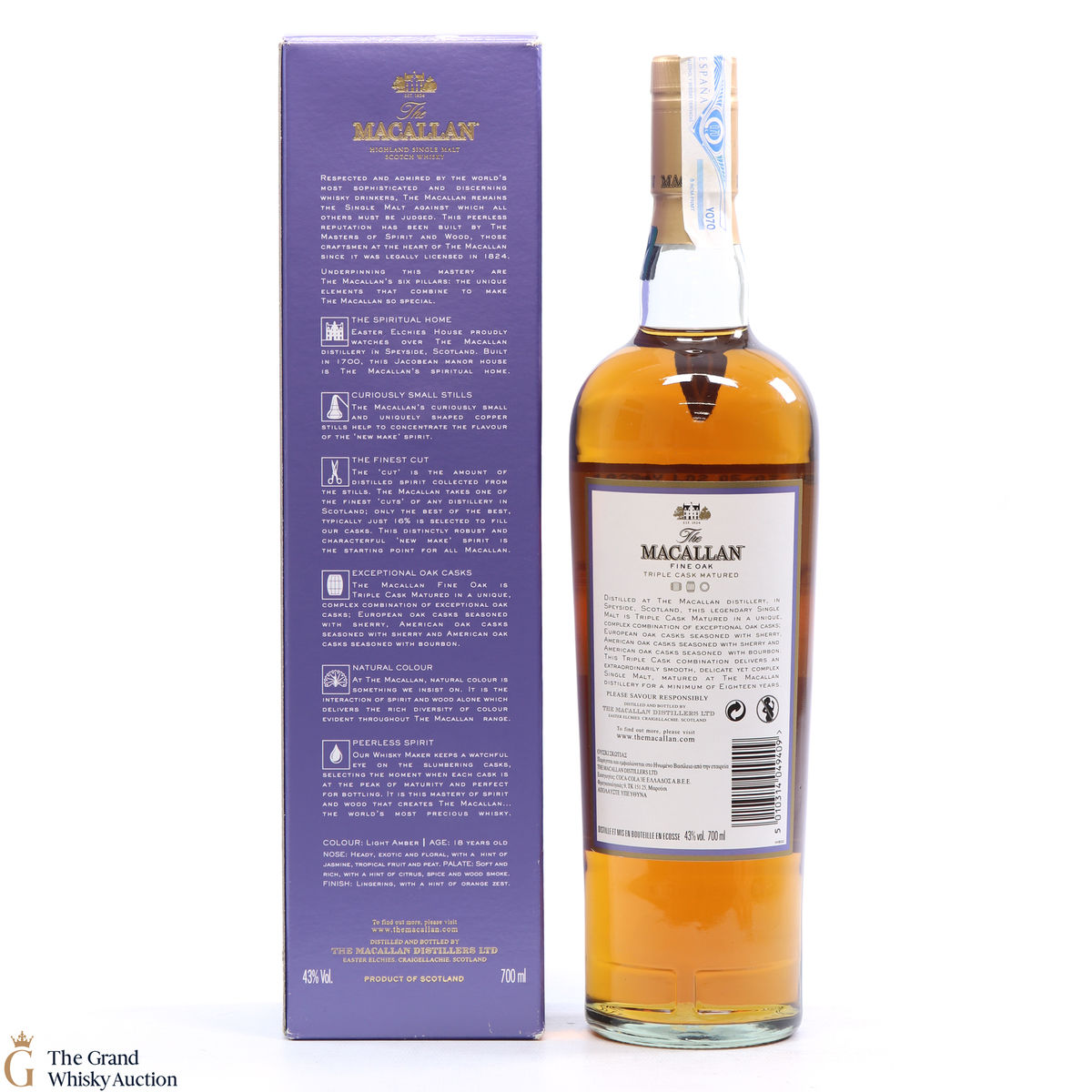 An 18 year old single malt, part of Macallan's Fine Oak range. It has been matured for eighteen years in three oak cask types; Europen oak seasoned with sherry, American oak seasoned with sherry and American oak seasoned with bourbon. This complex combination of casks has created a light amber single malt with tropical flavours balanced with wood smoke.