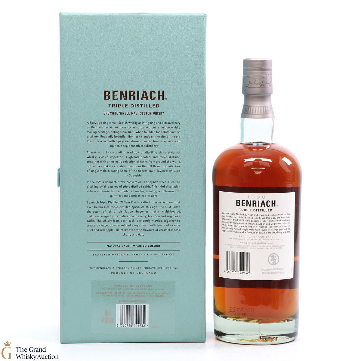A 22-year-old single malt from the BenRiach distillery, triple distilled in Sherry, Bourbon and Virgin Oak casks that were then married together.