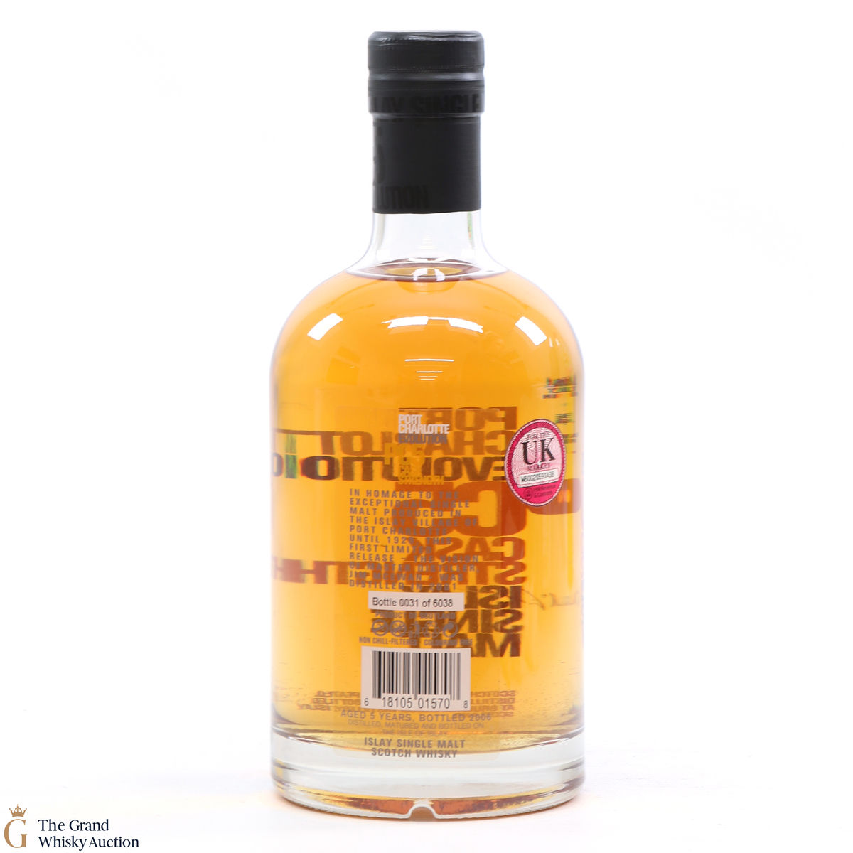 Port Charlotte PC5, produced by Bruichladdich Distillery, is a heavily peated spirit. It was the first release of heavily peated Port Charlotte and was produced in 2001 from some of the first spirits to be produced after the distillery's reopening. The single malt was bottled at 5 years old in 2006 and was limited to 6038 bottles.