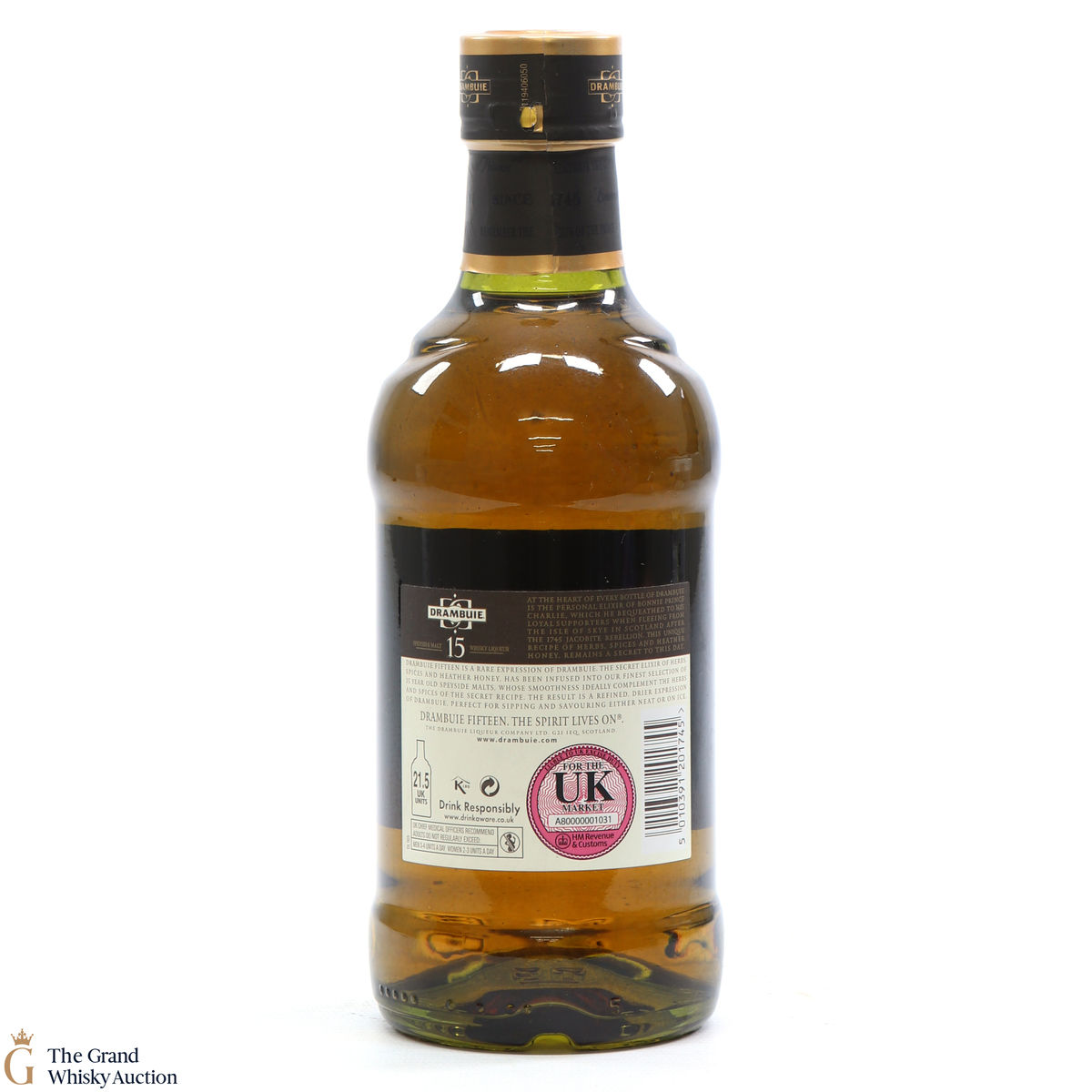 This bottling of Drambuie Whisky Liqueur is a selection of their finest 15-year-old Speyside malts. Produced and bottled in Scotland at an ABV of 43%.