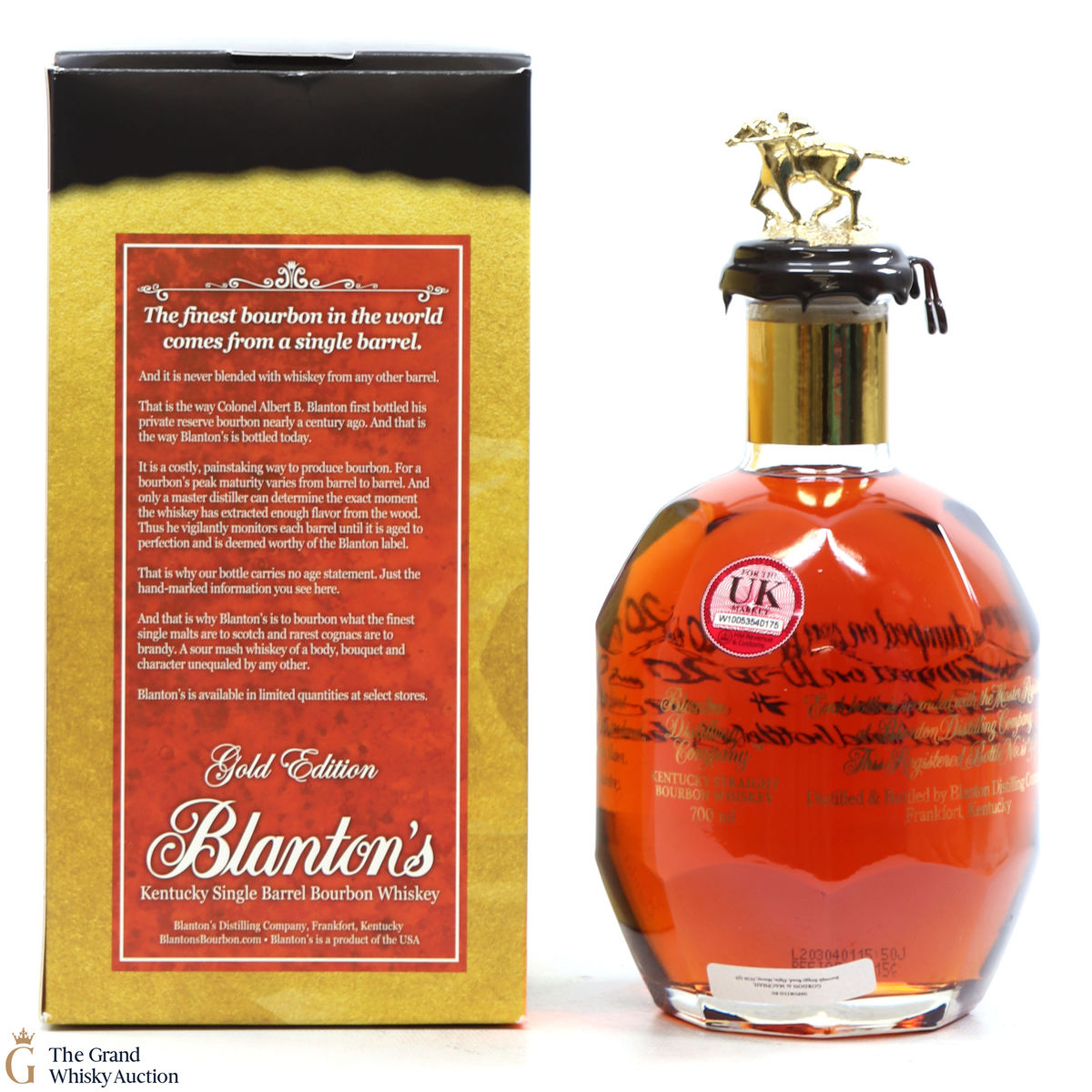 PLEASE NOTE: The wax seal on Blanton's bottles are prone to cracking in transit due to their design. Therefore, as stated in our T&C’s, we do not and will not accept liability should the seal be breached, broken, split or leak in transit. Additionally, please know due to the design of the internal cardboard packaging that surrounds the top of the bottles, it too may be torn. By bidding on this lot you have understood this to be true. Insurance is for complete breakage or loss in transit only.