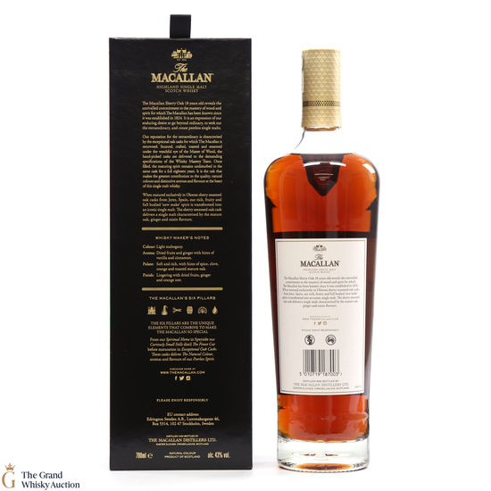 This annual release of The Macallan's popular 18 Year Old Sherry Oak is matured exclusively in sherry seasoned casks, built from both Spanish and American oak, providing a beautifully dark flavour with rich aromas.