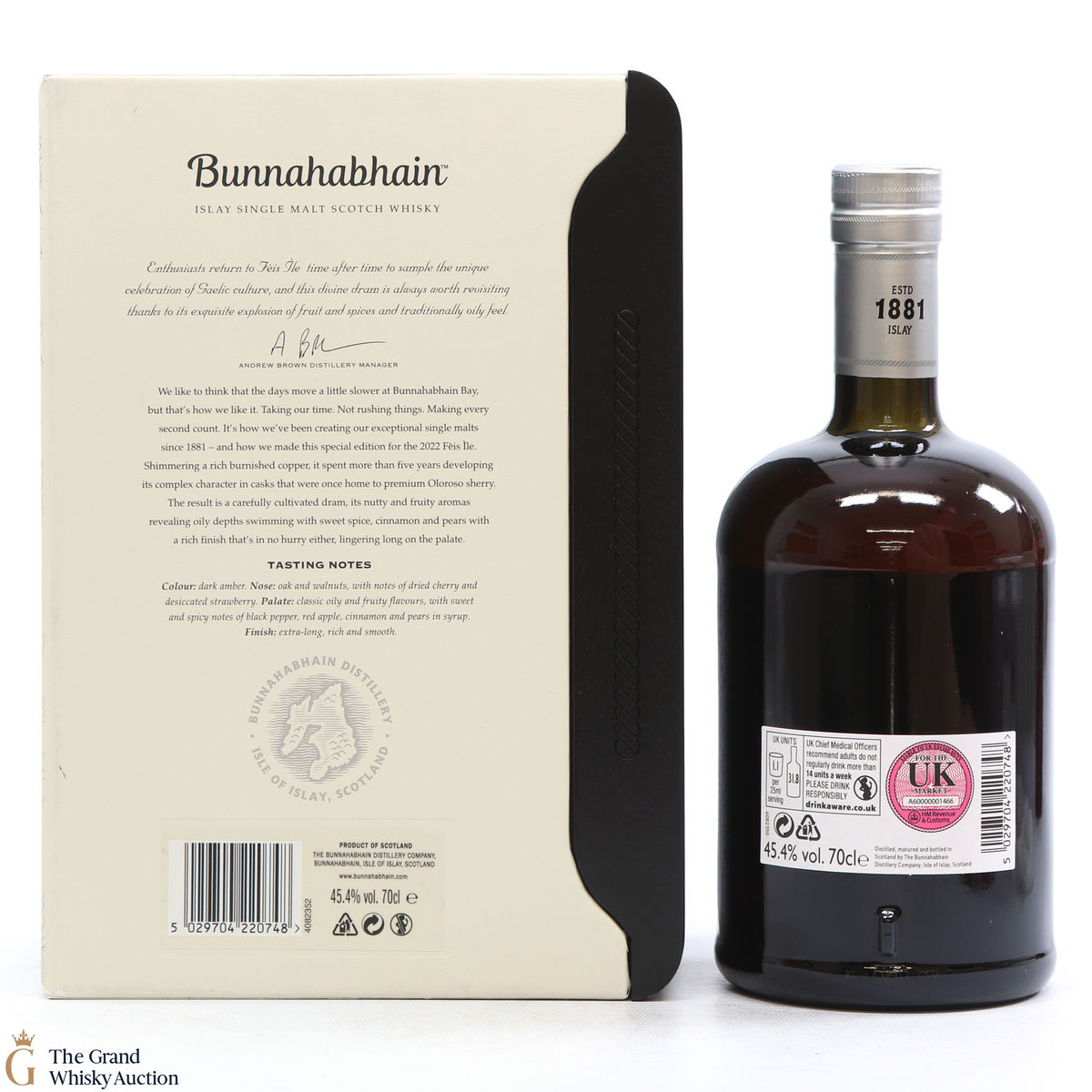 Matured slowly in Bunnahabhain's coastal warehouses for a total of over 30 years. Exploding with fruit and spices with the signature Bunnahabhain 'oily' feel. Bottled with an abv of 45.4%, non-chill filtered and natural colour. One of only 286 bottles released.
