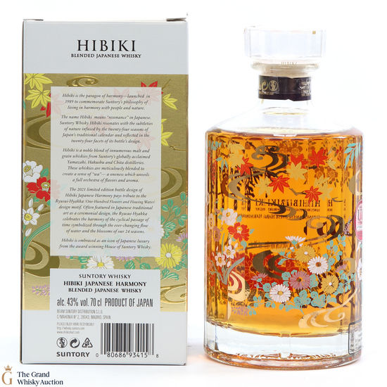 This is a limited edition, specially designed bottle with painted flowers and flowing ribbons of water. The 2021 special edition pays homage to the Ryisui-Hyakka (One Hundred Flowers and Flowing Water) and celebrates different seasonal flowers which help characterise the Japanese seasons. 5 types of casks were used and in typical Hibiki fashion, the bottle always has 24 facets which represent 24 seasons in the Japanese lunar calendar.