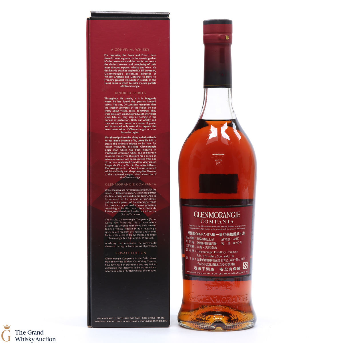 After first maturing in American white oak ex-bourbon barrels, the Companta was matured in 60% Burgundy wine casks from Clos de Tart and 40% Rhône Valley casks that previously held Rasteau, sourced by Glenmorangie's Director of Distilling, Dr. Bill Lumsden.