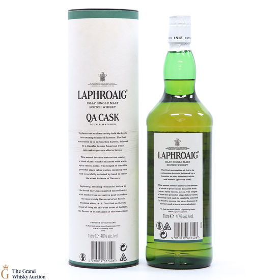 A litre bottling of Laphroaig's QA Cask single malt Scotch whisky. The name comes from the Latin phrase 'Quercus Alba', meaning white oak. This single malt is double matured - it was initially matured in ex-bourbon barrels before a finishing period in charred American white oak casks.