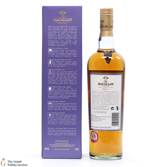 An 18 year old single malt, part of Macallan's Fine Oak range. It has been matured for eighteen years in three oak cask types; Europen oak seasoned with sherry, American oak seasoned with sherry and American oak seasoned with bourbon. This complex combination of casks has created a light amber single malt with tropical flavours balanced with wood smoke.