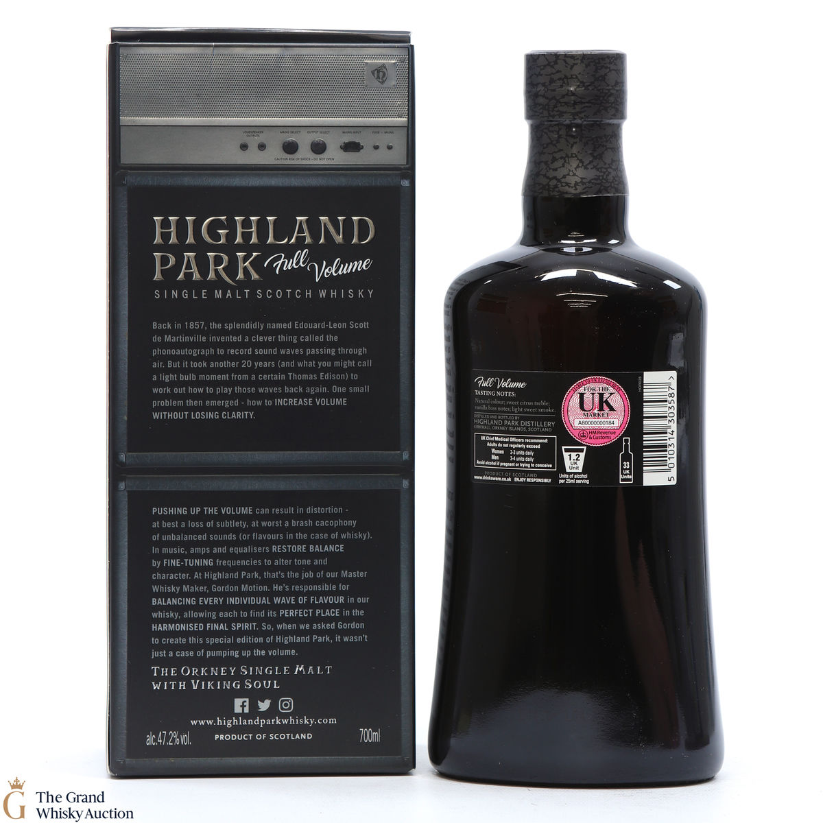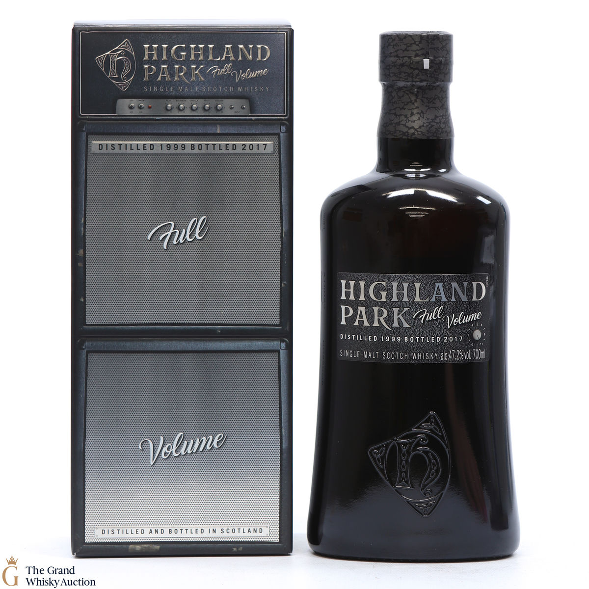 Full Volume by Highland Park was distilled in 1999 and bottled in 2017 from 481 casks. The single malt was matured exclusively in first-fill bourbon casks and was bottled at 47.2% ABV and comes presented in a themed presentation box resembling speaker.