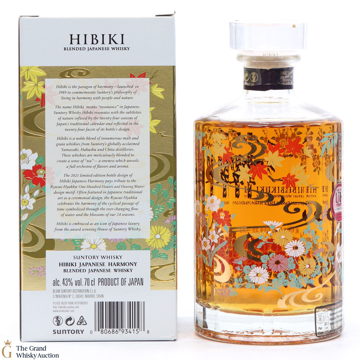 This is a limited edition, specially designed bottle with painted flowers and flowing ribbons of water. The 2021 special edition pays homage to the Ryisui-Hyakka (One Hundred Flowers and Flowing Water) and celebrates different seasonal flowers which help characterise the Japanese seasons. 5 types of casks were used and in typical Hibiki fashion, the bottle always has 24 facets which represent 24 seasons in the Japanese lunar calendar.