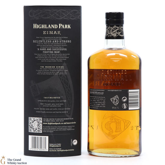 Einar is from Highland Park's travel retail Warrior series. It is named after Einar Sigurdsson who is documented in the Orkneyinga Saga as 'hard and successful man' that once ruled Orkney, where the Highland Park distillery resides. This single malt has been matured in Sherry seasoned American and European oak casks. Warm flavours of zesty dried orange peel and vanilla pods sweetly unfold in each dram of Einar.