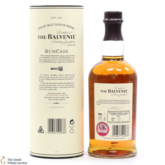 This is an increasingly rare bottling of Balvenie. The Rum Cask features Balvenie single malt which had matured in traditional oak casks for at least 17 years, that was then transferred into casks that had previously held Jamaican Sweet Rum.