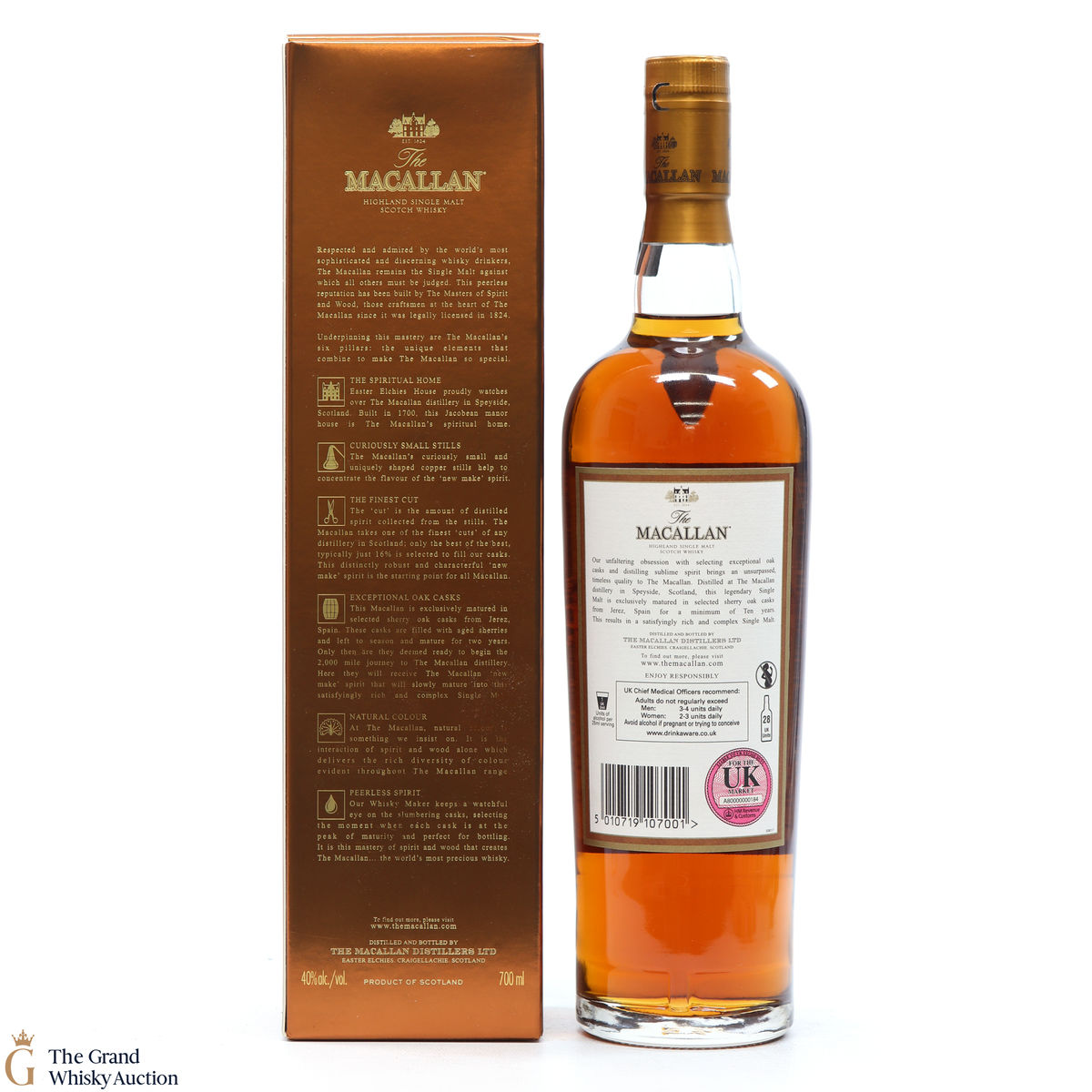 A 10 year old single malt from The Macallan Distillery. It has been exclusively matured in selected sherry oak casks from Jerez, Spain.