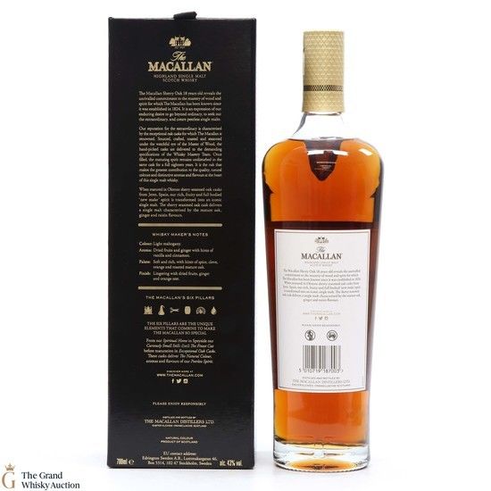 This annual release of The Macallan's popular 18 Year Old Sherry Oak is matured exclusively in sherry seasoned casks, built from both Spanish and American oak, providing a beautifully dark flavour with rich aromas.