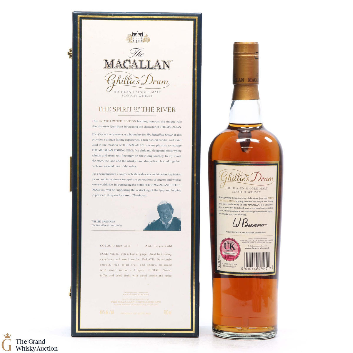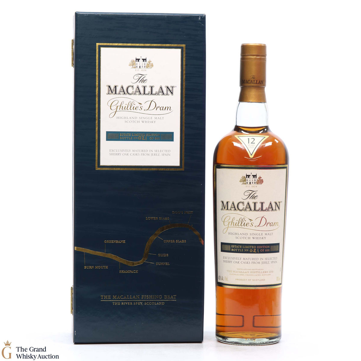 This unique lot is a limited edition Ghillie's Dram from Macallan. Dedicated to the Ghillie Willie Bremner, who operates in the River Spey. Included with this bottle of 12 Year Old single malt is two fly fishing hooks and a watercolour of the River Spey.
