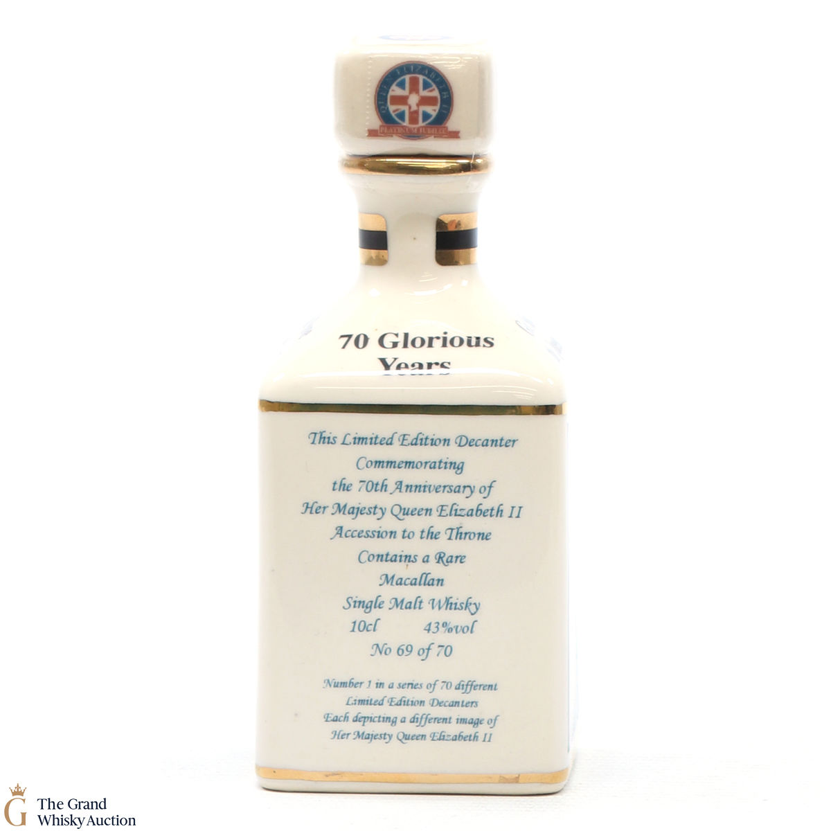 A mini decanter commemorating the 70th Anniversary of Her Majesty Queen Elizabeth II Accession to the Throne. Filled with a rare Macallan, there were only 70 full sets released which consisted of 70 different bottles.