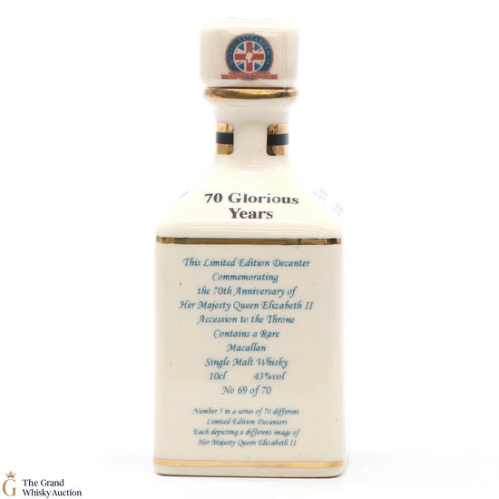A mini decanter commemorating the 70th Anniversary of Her Majesty Queen Elizabeth II Accession to the Throne. Filled with a rare Macallan, there were only 70 full sets released which consisted of 70 different bottles.