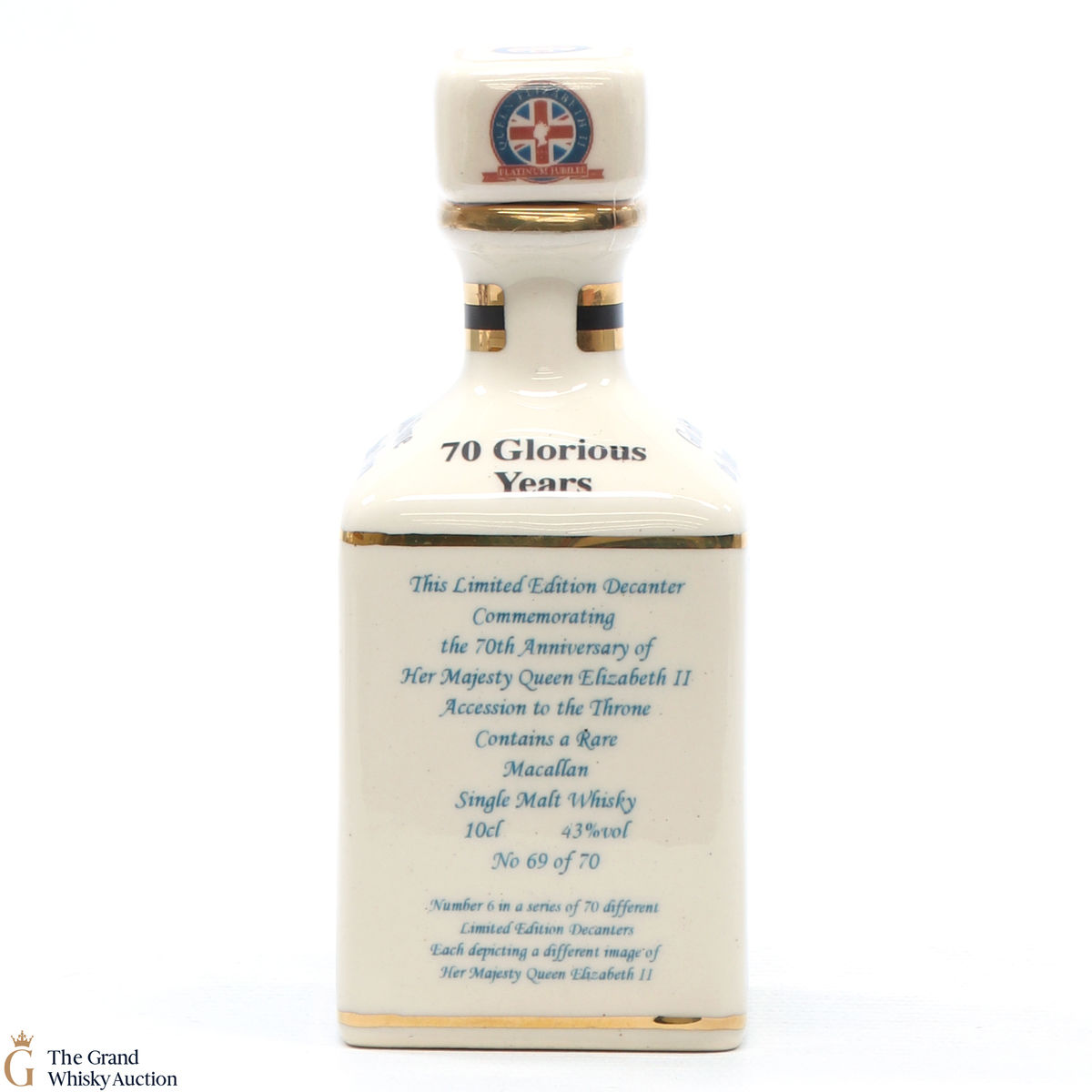 A mini decanter commemorating the 70th Anniversary of Her Majesty Queen Elizabeth II Accession to the Throne. Filled with a rare Macallan, there were only 70 full sets released which consisted of 70 different bottles.
