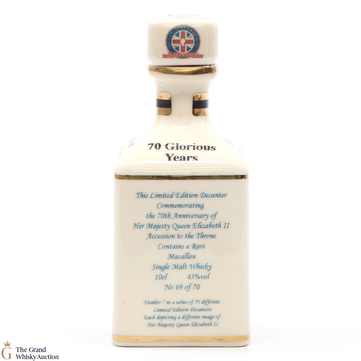 A mini decanter commemorating the 70th Anniversary of Her Majesty Queen Elizabeth II Accession to the Throne. Filled with a rare Macallan, there were only 70 full sets released which consisted of 70 different bottles.