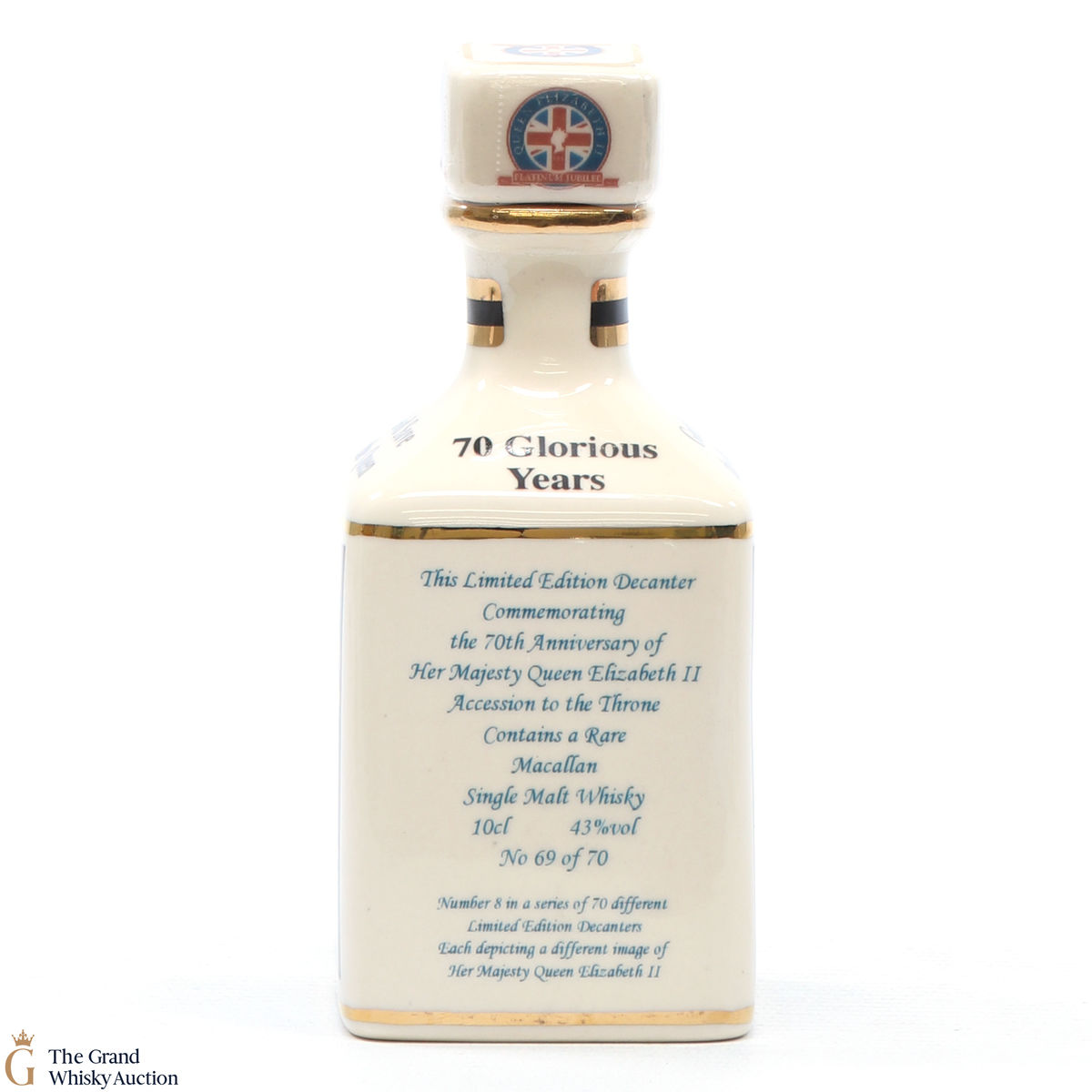 A mini decanter commemorating the 70th Anniversary of Her Majesty Queen Elizabeth II Accession to the Throne. Filled with a rare Macallan, there were only 70 full sets released which consisted of 70 different bottles.