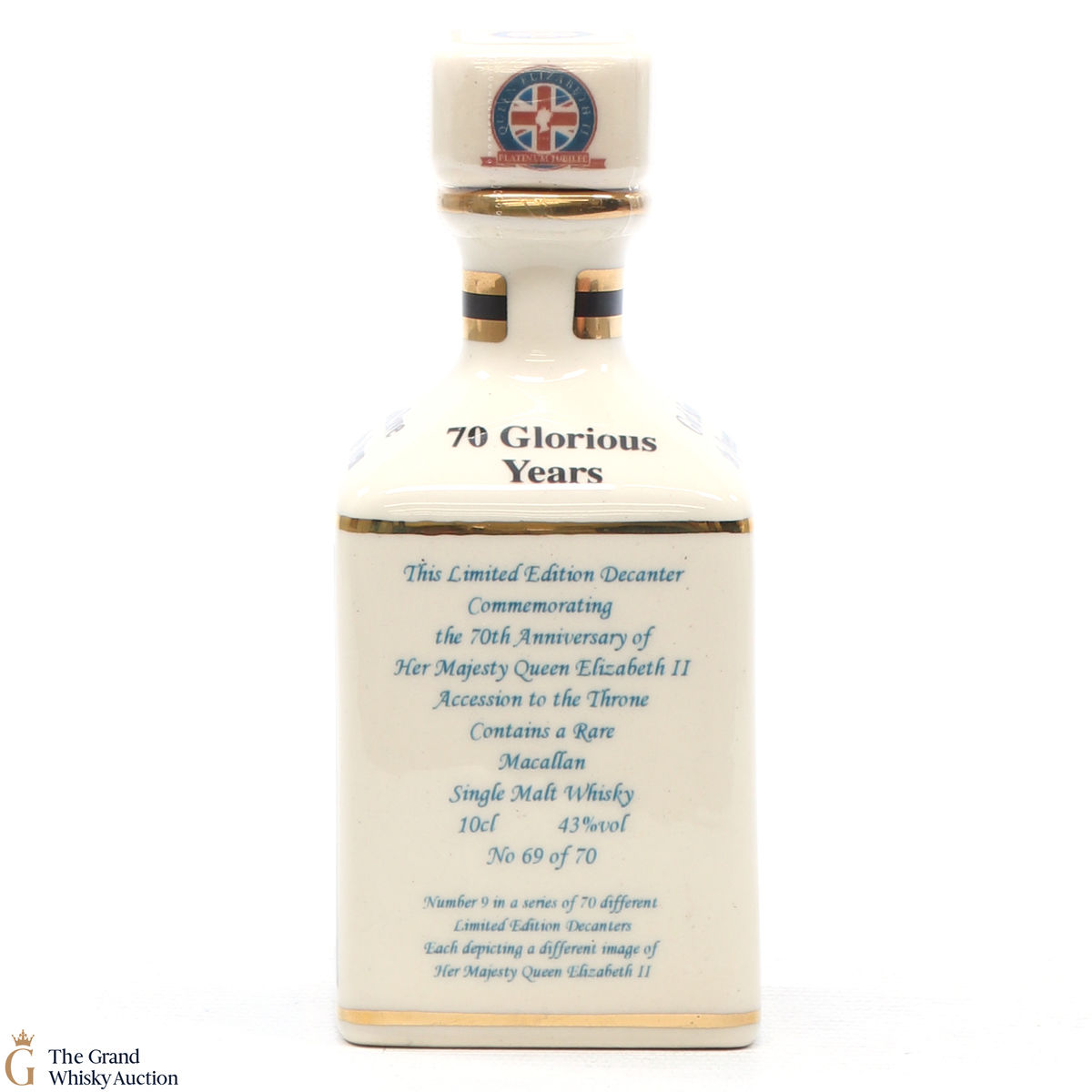 A mini decanter commemorating the 70th Anniversary of Her Majesty Queen Elizabeth II Accession to the Throne. Filled with a rare Macallan, there were only 70 full sets released which consisted of 70 different bottles.