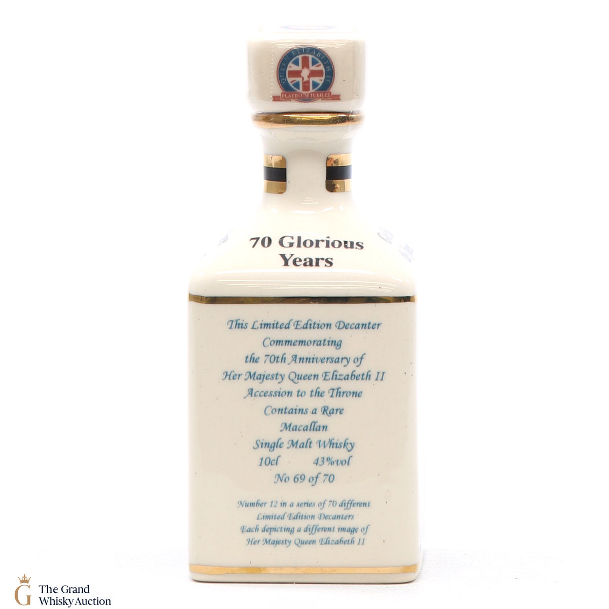 A mini decanter commemorating the 70th Anniversary of Her Majesty Queen Elizabeth II Accession to the Throne. Filled with a rare Macallan, there were only 70 full sets released which consisted of 70 different bottles.