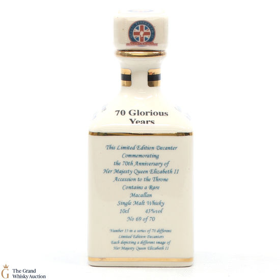 A mini decanter commemorating the 70th Anniversary of Her Majesty Queen Elizabeth II Accession to the Throne. Filled with a rare Macallan, there were only 70 full sets released which consisted of 70 different bottles.